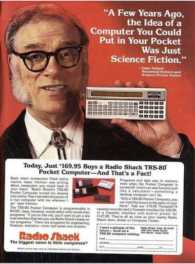 I vaguely remember the TRS-80 Pocket Computer. Introduced in 1980, this little device was manufactured and marketed by the Tandy Corporation/Radio Shack. (Every shopping mall in the 1980s had a Radio Shack.) Science fiction author Isaac Asimov appeared in a series of marketing spots for the gadget.