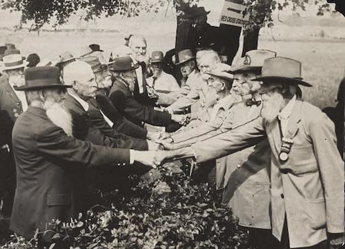 Union and Confederate veterans shake hands at the Gettysburg reunion of 1913.